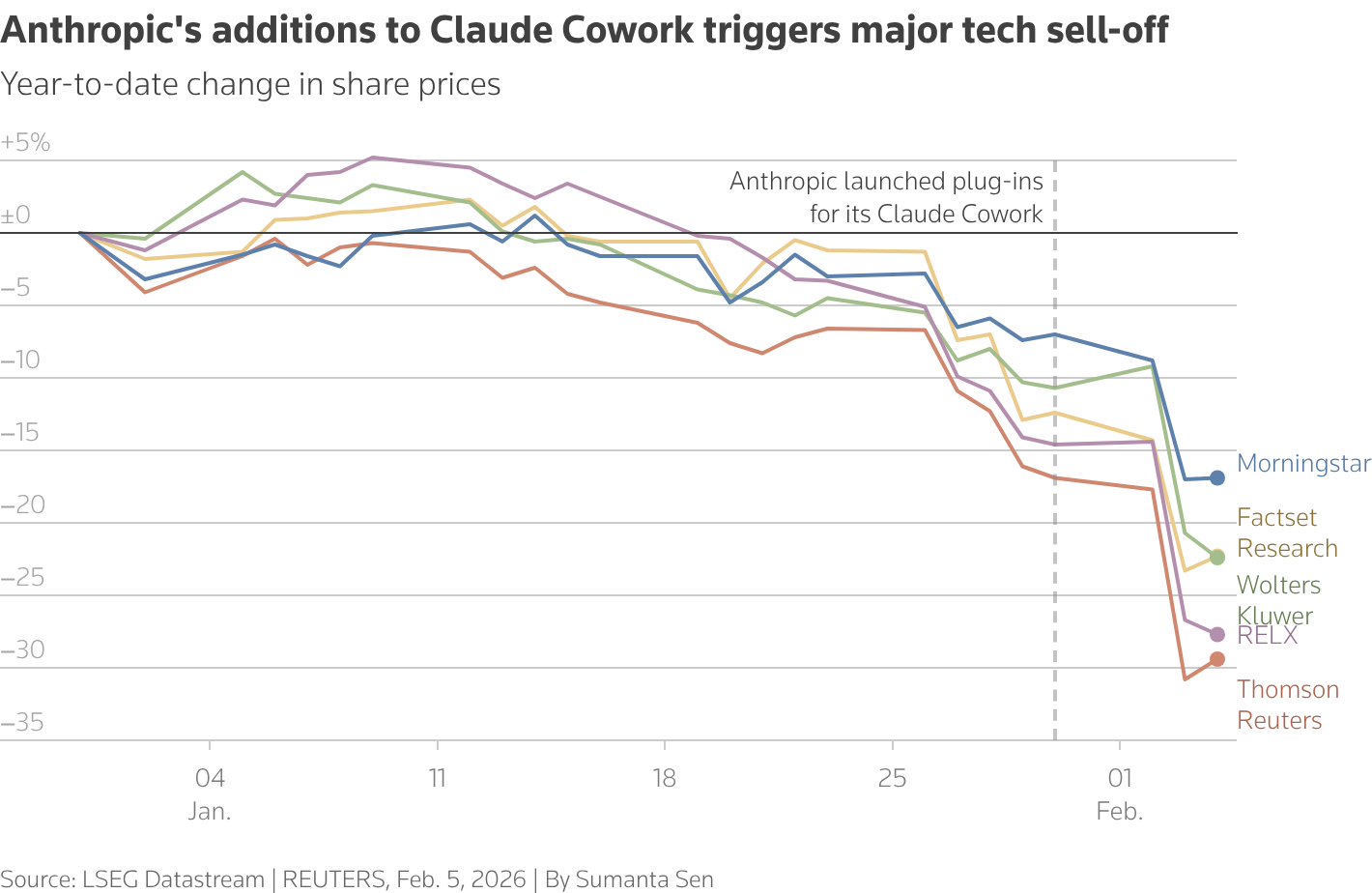 They've benefited from the AI boom in different ways, but now Barclays says that trade is "seeing extreme dispersion". In other words, the market is sifting between the winners and losers with more conviction. The sensitivity to which companies are benefiting or suffering from AI disruption is evident in sliding software and data analytics stocks. They have plunged as traders honed in on the existential threat posed by increasingly powerful AI models. AI enablers, companies contributing to the global AI data centre build-out, meanwhile, have fared better. But with the spectre of a bubble popping and markets near record highs, it would be wise to hold onto your hats.